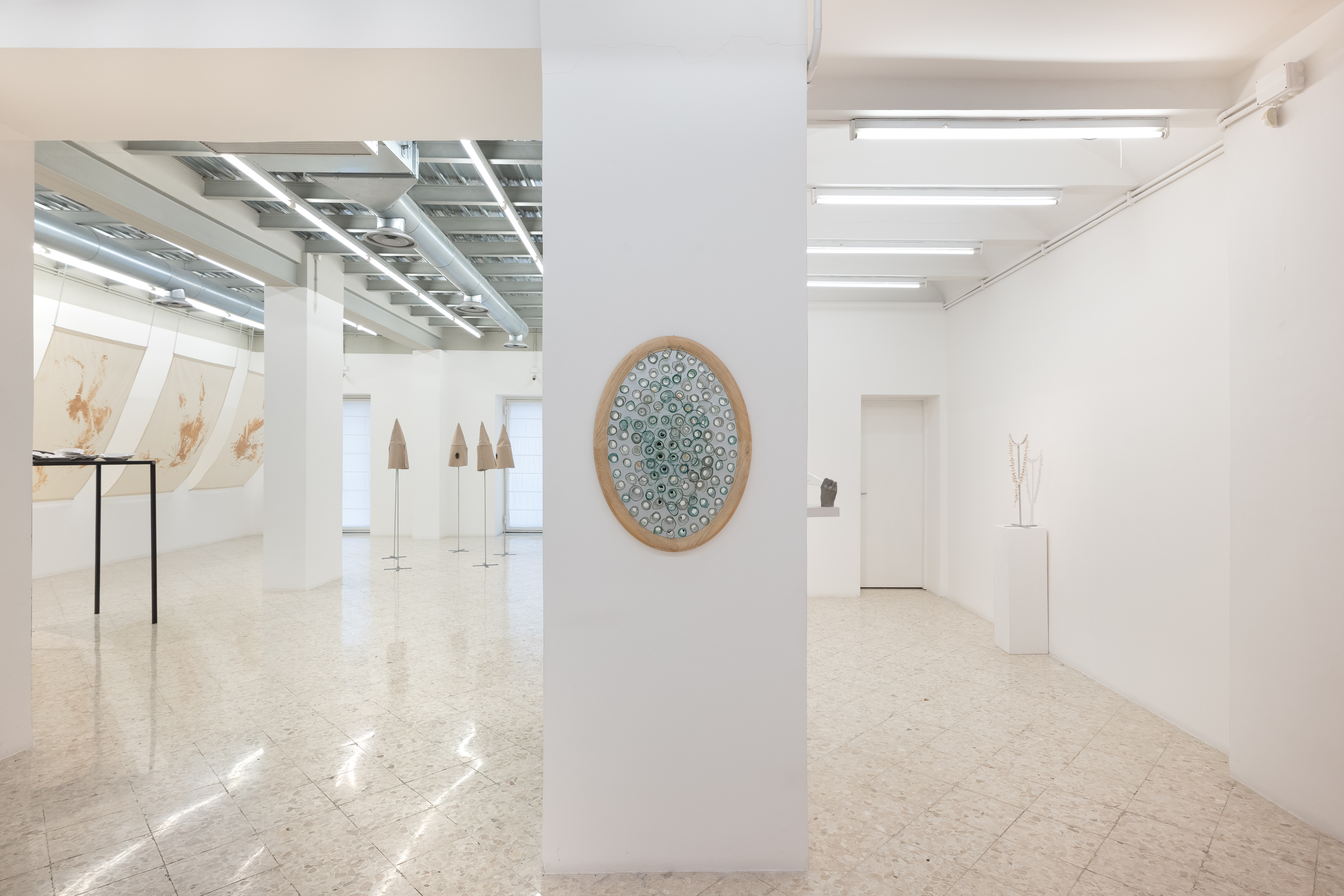 Other bottle necks populate the exhibition: they are menacingly wielded by hands that emerge from the walls; cold, greedy hands with silver-painted nails. Or they are embedded directly into the wall, making it bleed; but the dripping is toxic, made of lead. Or, arranged within an oval frame, they arm a mirror, in which one will find themselves, pierced and shattered between shards of glass.